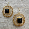 オニキスの石は、16世紀の廷臣が解釈したように、ウェブまたは世界の中心に配置されています。このルネッサンスデザインの象徴的なウェブ設定は、自然な目を引くものです。 24Kゴールドとスターリングシルバーのピアス用フープバック。サイズ1 5/8インチ。